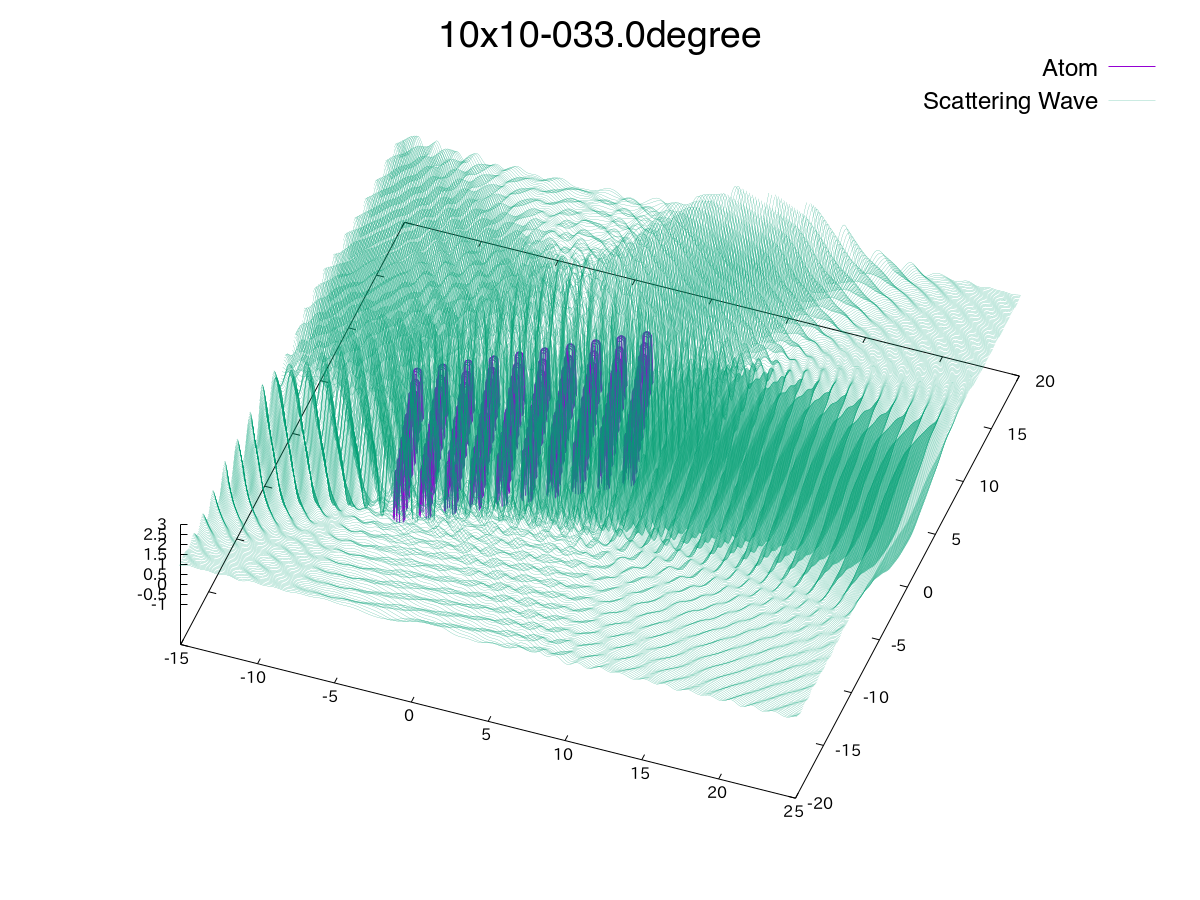 とすると「test_SctrWave.dat」と「test_Atom.dat」の2つのファイルが出力される。 これらの「*_SctrWave.dat」および「*_Atom.dat」にある座標データをgnuplotなど,グラフ作成ソフトで表示させれば散乱体と散乱波の関係が分かりやすい。