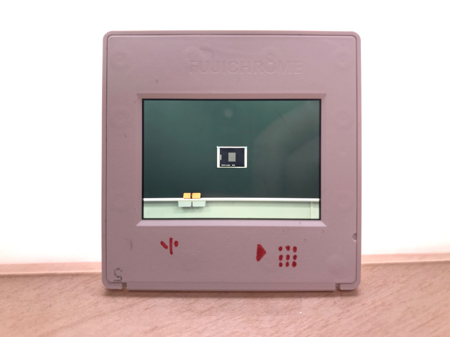 実際のスライドはこんな感じ。中心のパターンにレーザー光を当てる。黒板消し・チョーク受けが判るね。