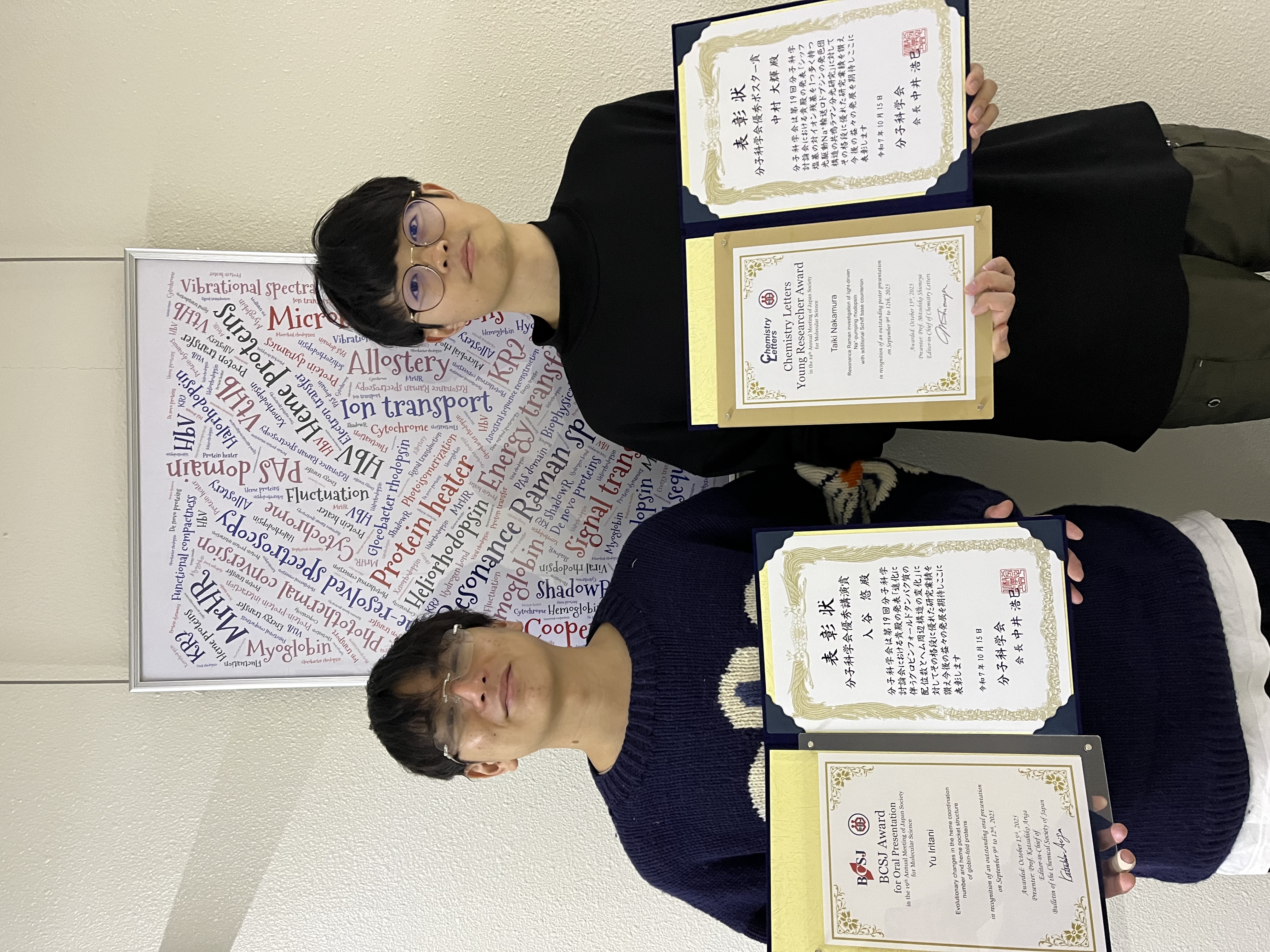 9月9日~12日に開催されました、第19回分子科学討論会で、入谷悠君(D2)が分子科学会優秀講演賞を、中村大輝君(D1)が分子科学会優秀ポスター賞を受賞しました(こちら)。入谷君はBCSJ Awardを、中村君はChemistry Letters Young Researcher Awardを併せて受賞しました。
