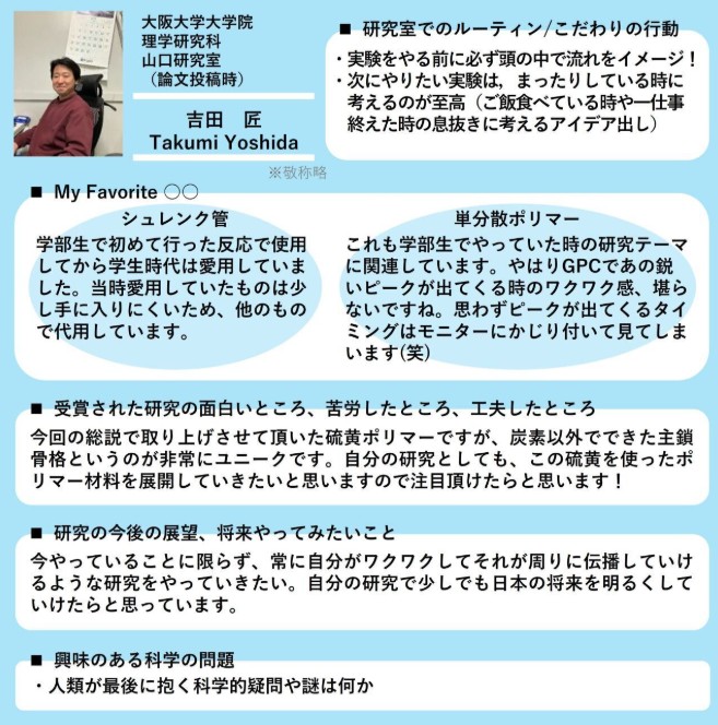 2025年年次大会でのM2の神岡くんの「硫黄とジハロゲン基をもつモノマーからなる硫黄含有ポリマーの合成とその物性評価」の発表が若手優秀発表賞を、M1の戸田くんの「単体硫黄とエピハロヒドリンを原料とした硫黄含有ポリマーの超迅速合成」の発表がポスター優秀発表賞を受賞しました(理学研究科のHPにも紹介されています)。。