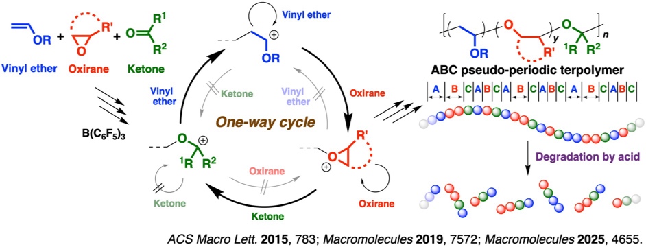 Sequence-controlled cationic terpolymerization of vinyl monomers, oxiranes, and carbonyl compounds